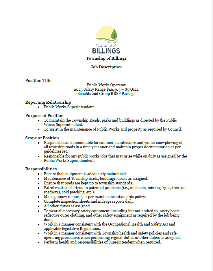 The Township of Billings is hiring for a Custodian/ Landfill Attendant (Casual Part-time).